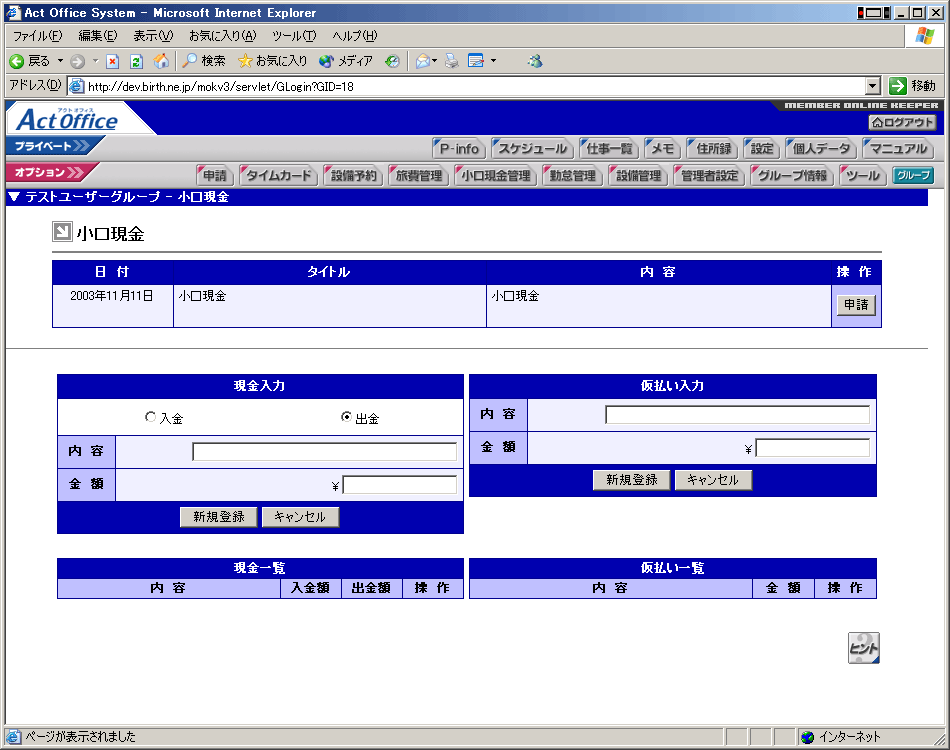 小口現金のタイトル・内容を登録して申請します。仮払いがある場合は同じく登録します。申請をし承認をされた場合は領収書等の提出のみ行います。承認されなかった場合は申請者の小口現金案件データへ戻されます。経理部門等は管理画面から承認・未承認の審査を行い承認の場合は決済済みデータに登録されます。未承認の場合は理由を書き添え申請者へ小口現金案件データを戻します。決済済み案件画面からブラウザ表示をクリックすることにより小口現金の帳票が表示され、これをプリントアウトすることにより帳票として活用できます。各社員別はもとより、営業所等出先機関の小口現金管理をリアルタイムで有効活用できます。