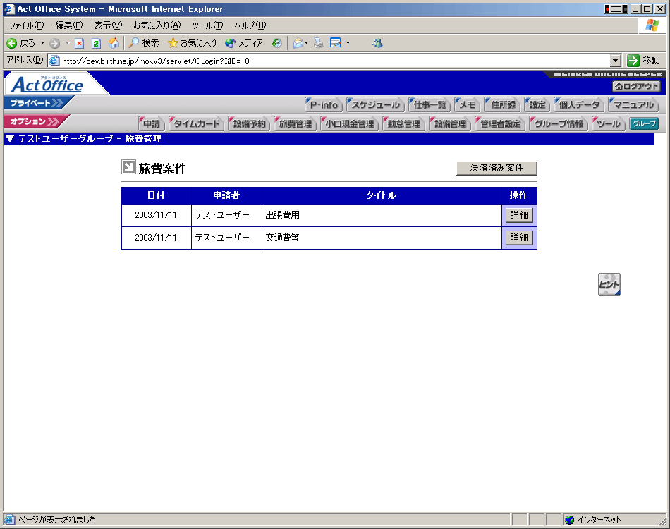 経理部門等は管理画面で旅費案件申請の審査を行います。承認する案件は承認ボタンをクリックすると決済済みデータに登録されます。未承認の場合は申請者へ理由を書き添え旅費案件データは戻されます。決済済みデータはブラウザ表をクリックすることにより旅費と仮払いをそれぞれ集計した帳票が表示され、これをプリントアウトして帳票として利用できます。すべてペーパーレスで処理ができます。