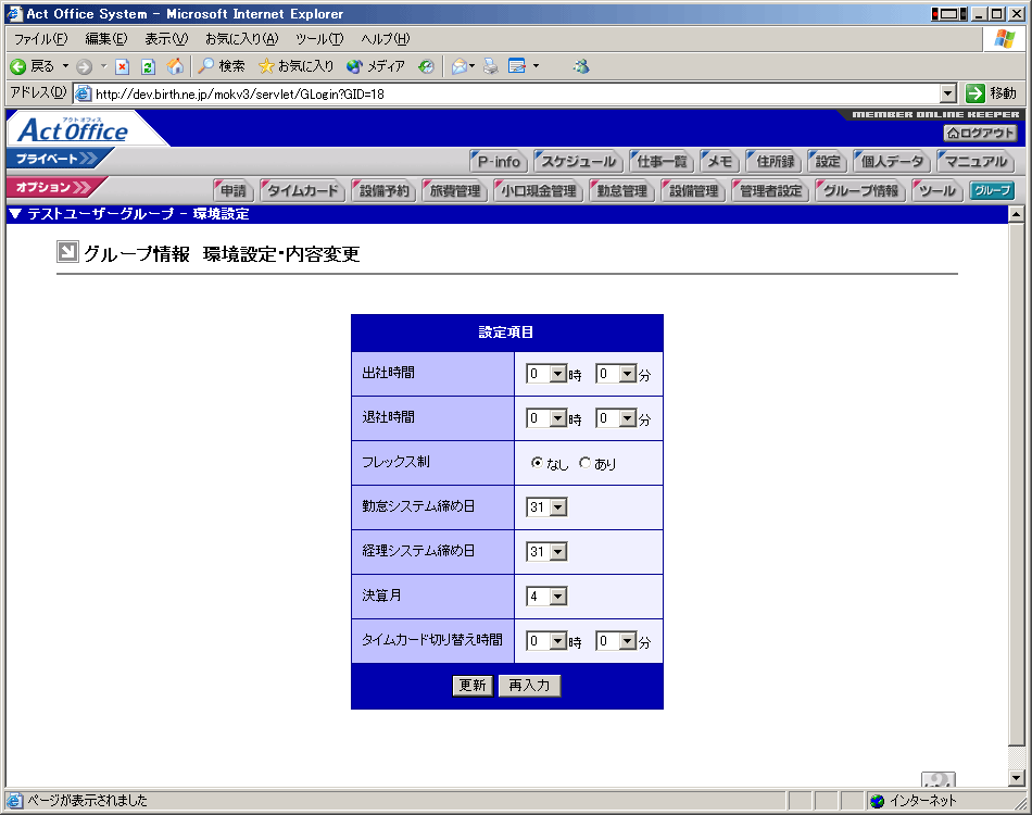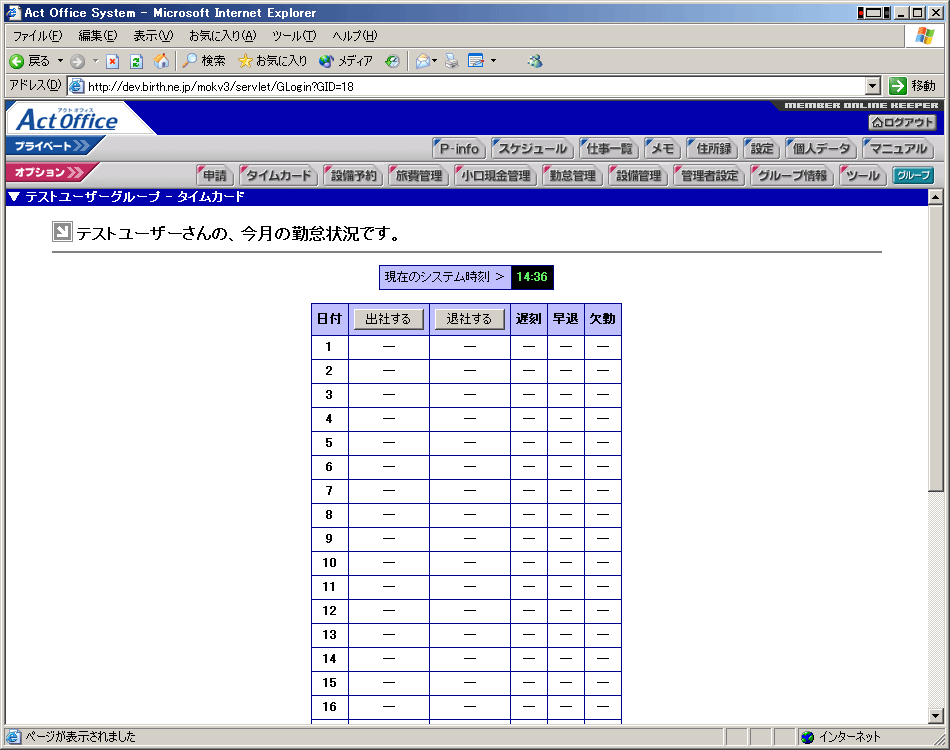 タイムカード画面から「出社する」「退社する」を選択すると当日の出社・退社時間が登録されます。遅刻・早退・欠勤の場合はその旨登録されます。遅刻・早退の場合理由入力画面が表示され理由を記入します。